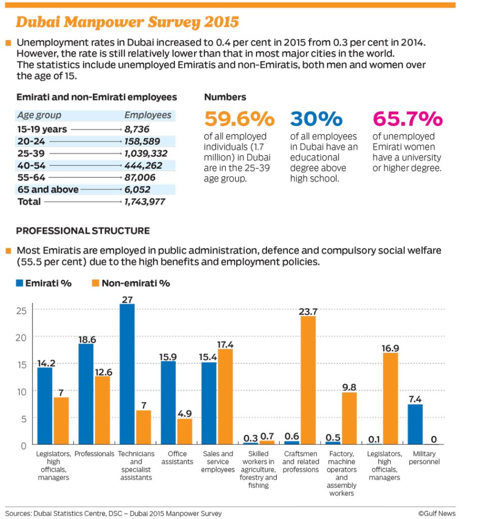Dubai: Dubai continues to have one of the lowest unemployment rates in the world, the latest Dubai Manpower Survey reveals. The survey conducted by the Dubai Statistic Centre (DSC) shows that unemployment rates in Dubai increased by 0.1 per cent — from 0.3 per cent in 2014 to 0.4 per cent in 2015. Source