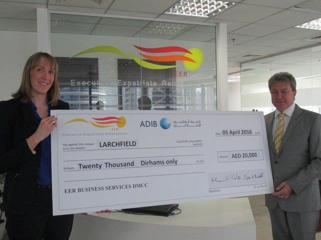 “James Berry (right) of James Berry and Associates, accepting a generous donation of AED 20,000 from Marie O’Neill (left) of Executive Expatriate Relocations, on behalf of his firm’s CSR project, Larchfield Tanzania Homes, a UK registered Charity (Charity Commission Reg # 1163227) towards the construction of an orphanage that will house and provide education for